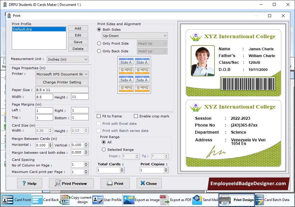 Software has two modes for designing student identity cards. Select any one mode as we have selected 'Design using Pre-defined Templates' for demonstration purpose.Software provides various pre-defined ID card samples, choose any one sample according to your choice. Enter card size and click on 'Fill user profile' button.Select Data Source, Series/Excel Column, Select Sides and click OK button.Using Card Properties and various Card Designing Objects you can make changes in ID card. To print designed ID card click print icon from tool bar.Here you can see designed ID card with Front and Back view. Click OK button to continue.Adjust various print settings and click on Print button to print designed ID cards.
