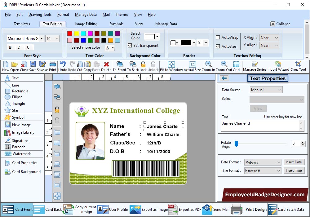 Student ID Card Designing Software designs student ID cards in rectangle, rounded rectangle and ellipse shapes. Software provides option to import excel file of student details to create ID cards for multiple students using 'Live Group and Batch Processing Mode' feature.